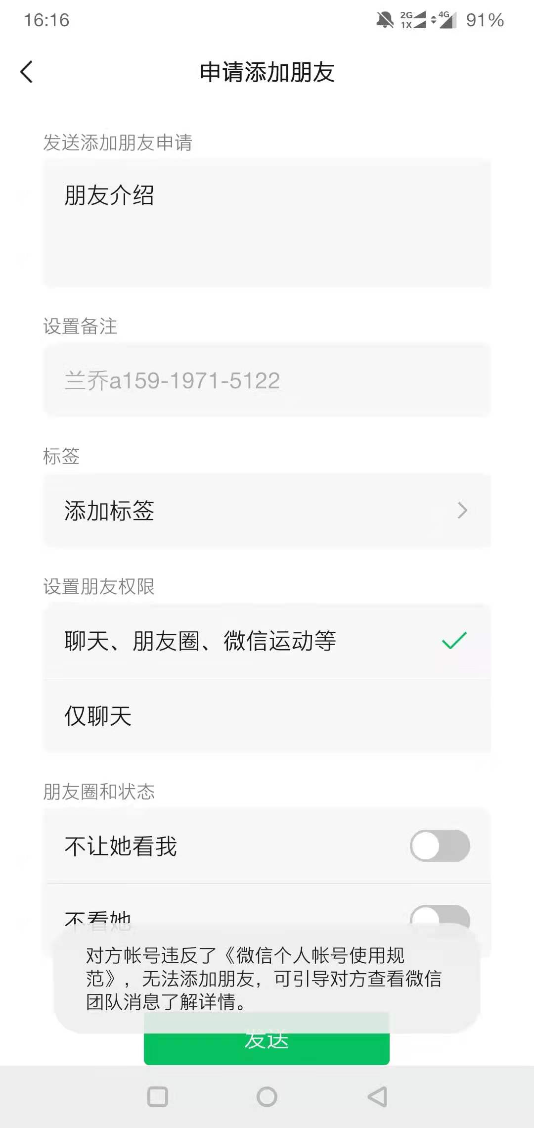 对方帐号违反了《微信个人帐号使用规范》,无法添加朋友,可引导对方查看微信团队消息了解详情。 lechen_ ...