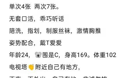 此女主打m,1500两小时,道具一应俱全,到位置遥控上楼,和照片八成相似,但年龄感觉32左右,如狼似虎。一 ...